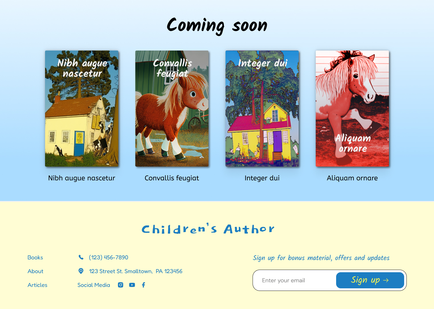 I'm an author that writes creative children's books. My website is bright and colorful but I feel like it could be more interactive and it could create more enthusiasm around my upcoming book releases. So I'd like to redo the footer and add a book preview with a form to sign up for my new newsletter. I'm not happy with the font for "Coming soon" so please add a new one.