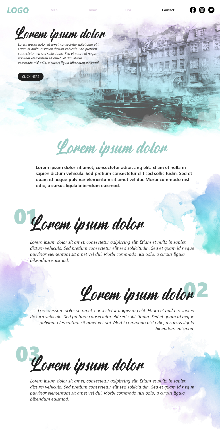 Build an artistic home page with decorative sections feauring a creative watercolor effect.